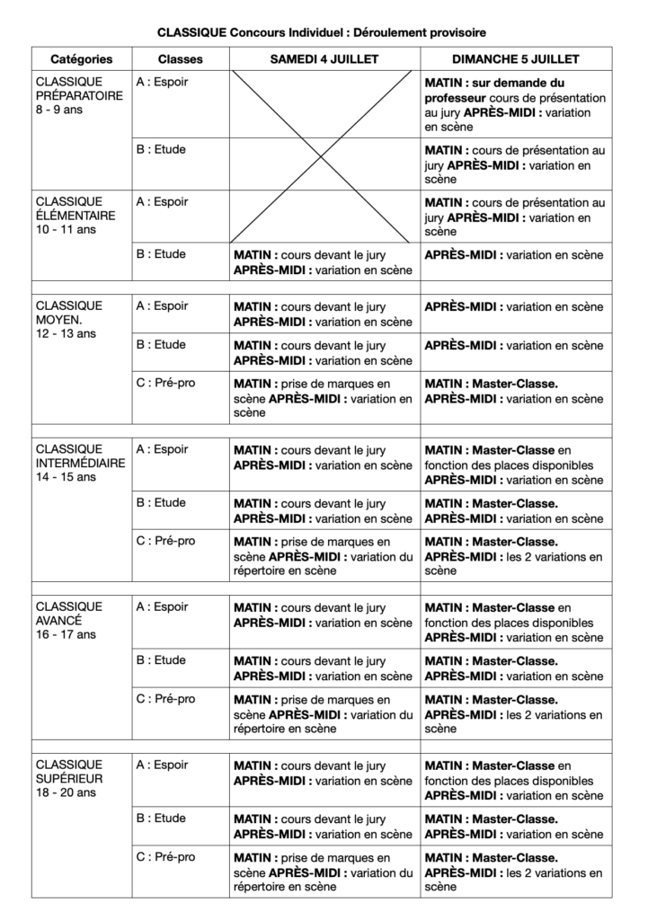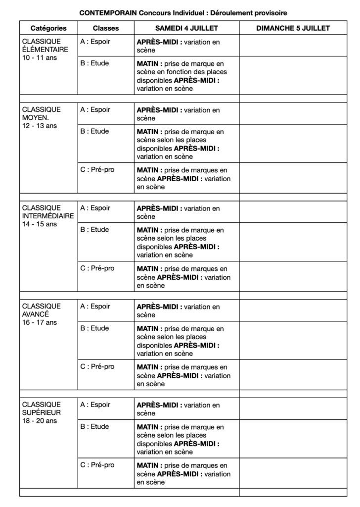 Rappel important : dans cette organisation, les candidats Classique de la catégorie Préparatoire A ou B ainsi que ceux de la catégorie Elémentaire A sont appelés à participer au concours uniquement le Dimanche. Les candidats en Contemporain (toutes catégories) uniquement le Samedi.