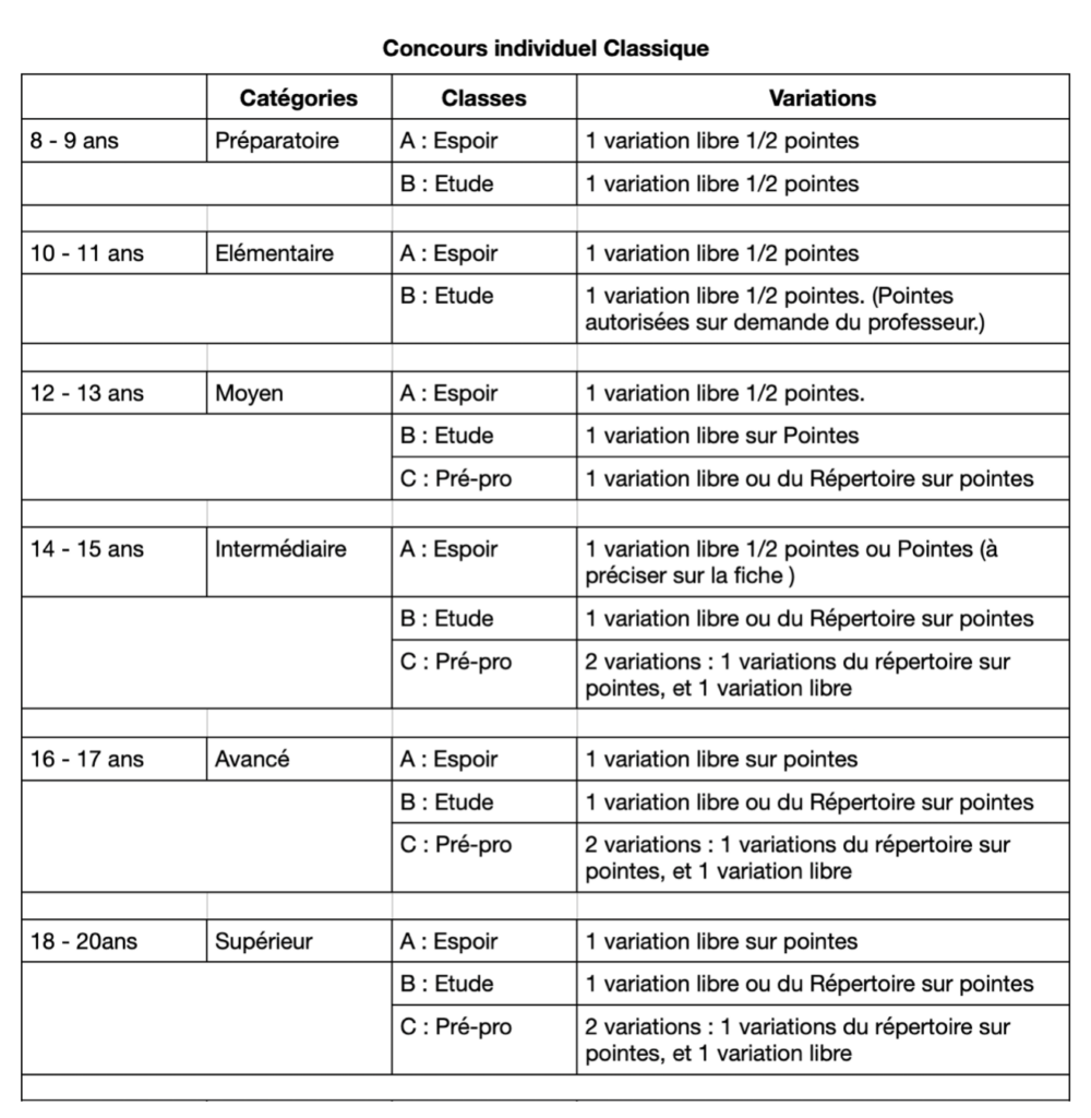 Pointes ou 1/2 pointes : Catégorie Classique Intermédiaire A. Ce choix est à préciser sur la fiche d’inscription.