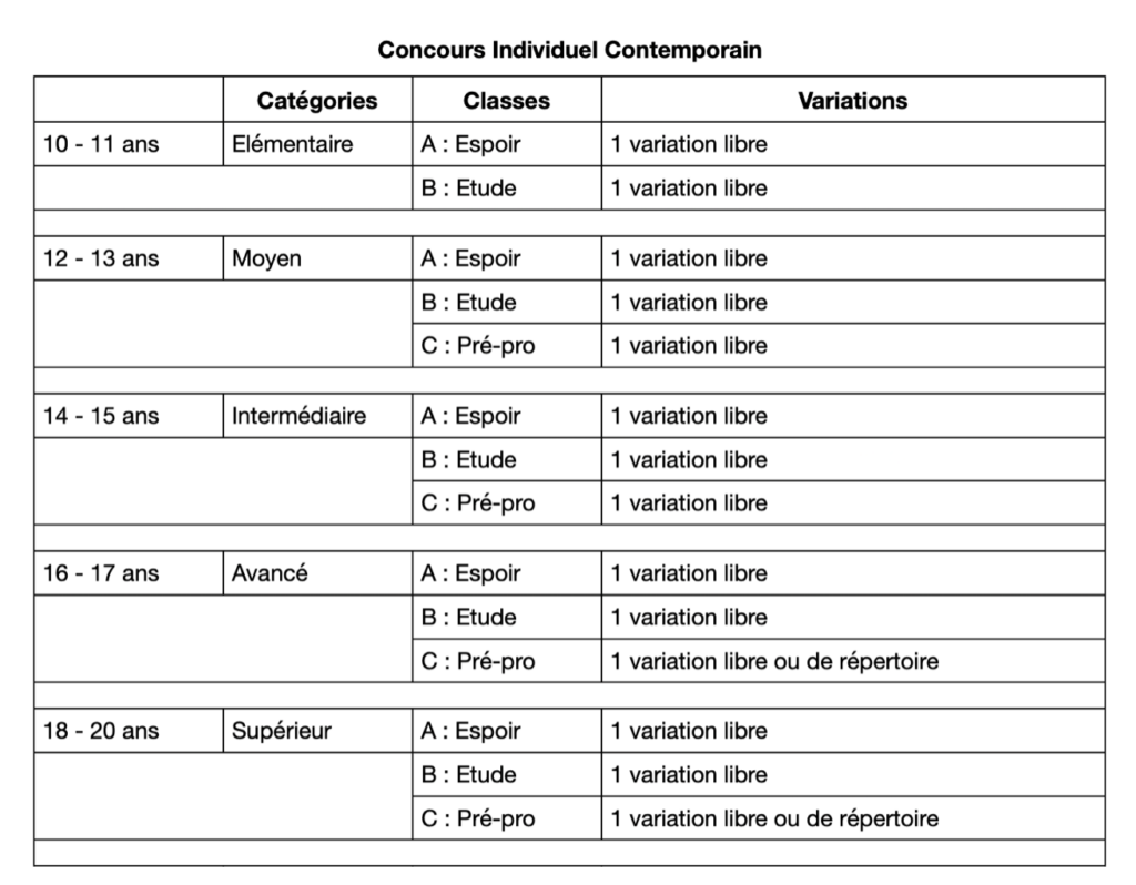 CONTEMPORAIN : Élémentaire ( 10 – 11 ans ), Moyen ( 12 – 13 ans ), Intermédiaire ( 14 – 15 ans ), Avancé ( 16 – 17 ans ), Supérieur ( 18 – 20 ans ).
